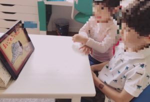 4月28日、本日はひらがなカードの読みを行った後に、聞き取った音声を、そのまま書き取る学習、ディクテーションを行いました。