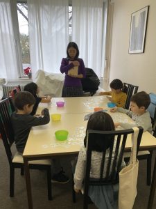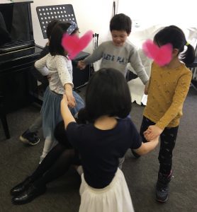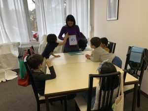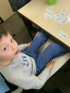 ひらがなの後は、みんなでできる伝承遊び、なべなべそこぬけと、かごめかごめをして遊びました。かごめかごめは、みんな後ろにいる子をすぐに当ててしまうこどもたちでした。
