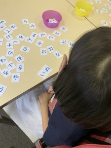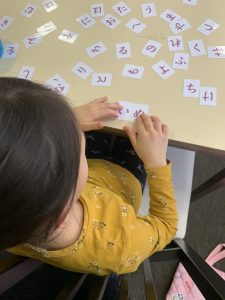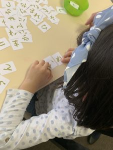 今日はひらがなの「め」を書く練習をし、その後、一人ずつひらがなカードをもらい、写真をみて文字探しをする遊びをしました。少し間違うことがあっても、一生懸命文字を探して並べていましたよ。